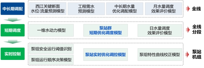 项目针对珠三角工程输水距离长、提水扬程高、边界扰动多、调度运行工况复杂的特点,提出时空双重解耦模型框架,将复杂调度问题按照“中长期-短期-实时”的时间尺度和“工程全线-全线分段-泵站机组”的空间尺度进行双向解耦和适配建模。