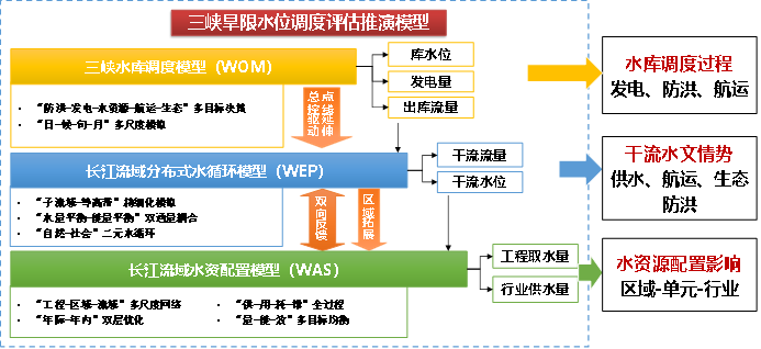 (1)构建了三峡水库旱限水位调度综合影响量化评估技术体系。提出了流域上游和下游相统筹、系统性与层次性相统筹、长期性与短期性相统筹、直接性和间接性相统筹的评估原则;构建了综合防洪、供水、发电、航运、生态五个维度兼顾效果、效益和风险三个类别的评估指标和评估方法;建立了精细化的三峡水库调度模型、长江流域水资源配置模型和长江流域二元水循环模型,为三峡旱限水位调度综合影响评估奠定了模型工具基础。